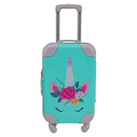 This lovely unicorn suitcase is made of sturdy plastic with reinforced corners, handle and wheels. Perfect for storing just a change of clothes for an overnight stay! Latch is easy to open.