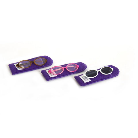 Perfect for your Treasured Doll's adventures every day - whether it be reading at the library or studying at school - pink and brown tortoiseshell eyeglasses will keep her looking trendy while the cool, white framed sunglasses will keep her shielded from the sun on those lovely summer afternoons. Have fun with three different colours to match your outfits. Comes with purple glasses case for each pair!