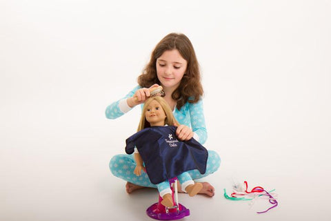 Only use a wire wig brush on your Treasured Doll. Check our our hair care section to caring for your dolls hair. Fill the spray bottle with water to mist your dolls hair when brushing. Fabulous hair styling with this treasured doll logo cape. Don't forget to check out our adorable salon chairs - made to make your styling easier and fun!