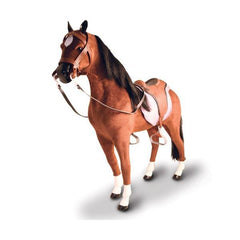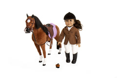19" Smooth Chocolate brown fabric horse with saddle, reins and small hand brush for grooming. Lovely details.  Sure to make any doll (or doll lover) happy!
