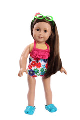 Lovely set comes with tropical swimming suit and matching swim goggles. Goggles so authentic, they are nearly waterproof! Adorable crocs finish out the look.