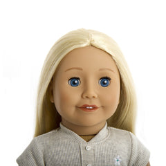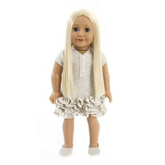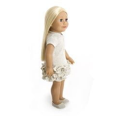 Our stunning fair skin doll 13 with dark blue eyes and long ash blonde curly hair. She comes complete in her bespoke grey dress with ruffled end and beautiful Treasured Dolls flower motif, also included is her faux leather grey mules and underwear. Her skin is high quality vinyl with cloth body perfect for cuddles. Her eyes open for daytime adventures and close when your fun is over and it’s time for bed. With moveable limbs she will make a great companion.