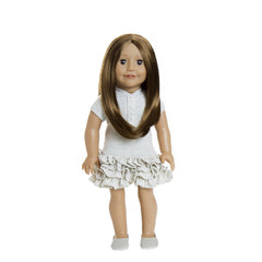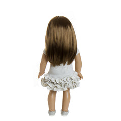 Our beautiful fair skin doll 15 with piercing brown eyes, and long curly dark brown hair and side parting. She comes complete in her bespoke grey dress with ruffled end and beautiful Treasured Dolls flower motif, also included is her faux leather grey mules and underwear. Her skin is high quality vinyl with cloth body perfect for cuddles. Her eyes open for daytime adventures and close when your fun is over and it’s time for bed. With moveable limbs she will make a great companion.